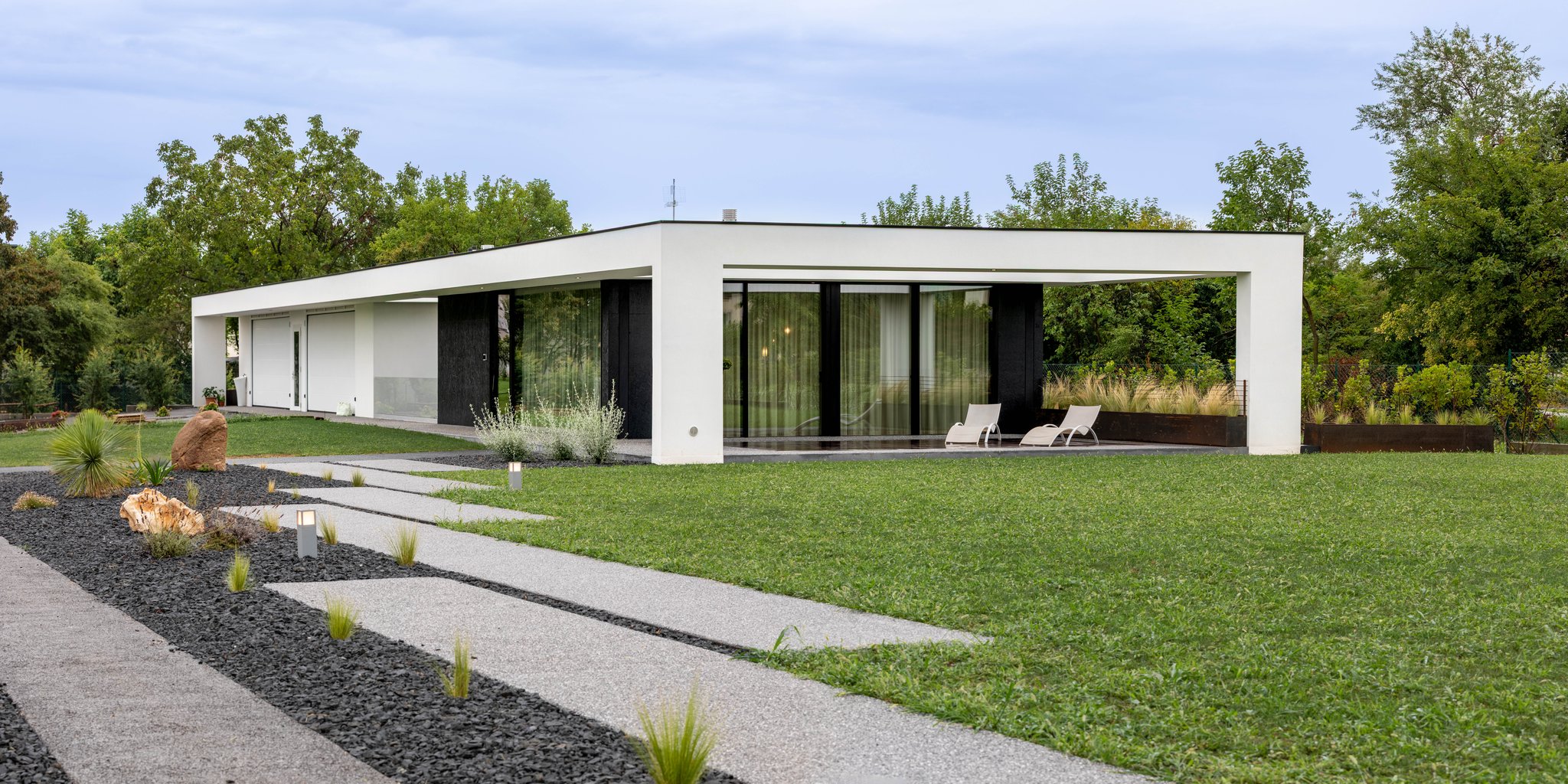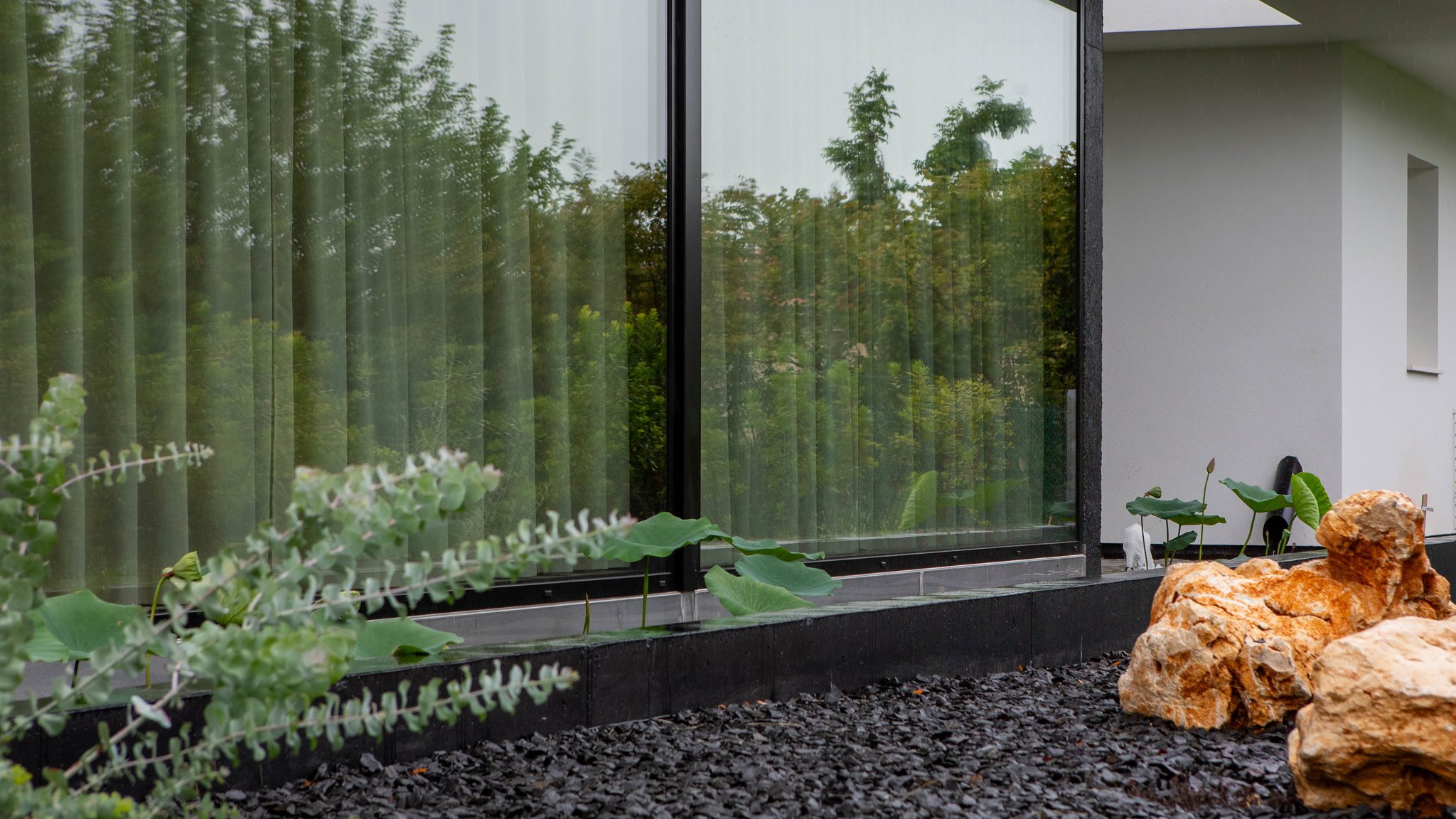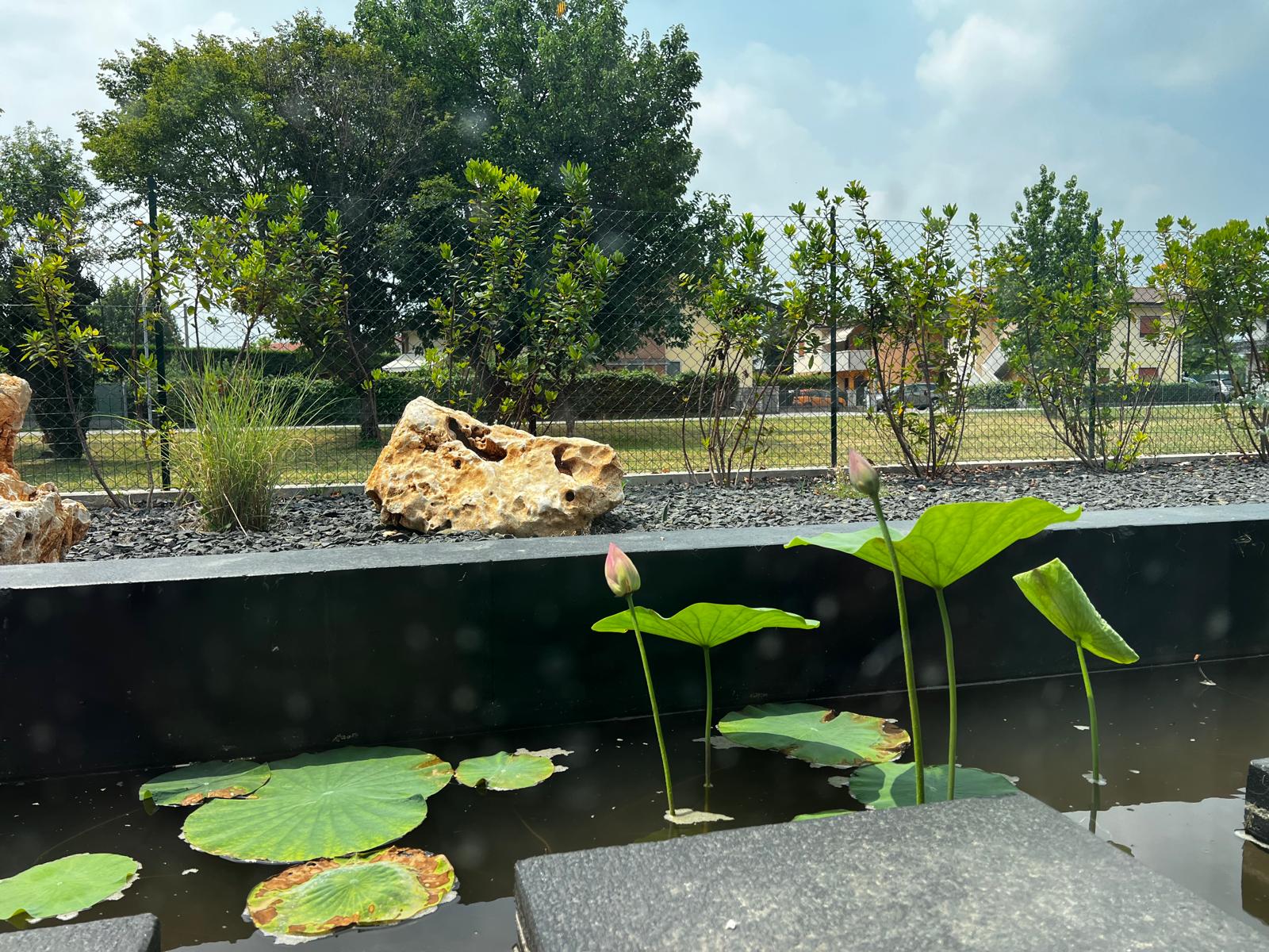 Ampie vetrate con vista esterna su vasca d'acqua e parco privato che donano luce naturale e un tocco esclusivo