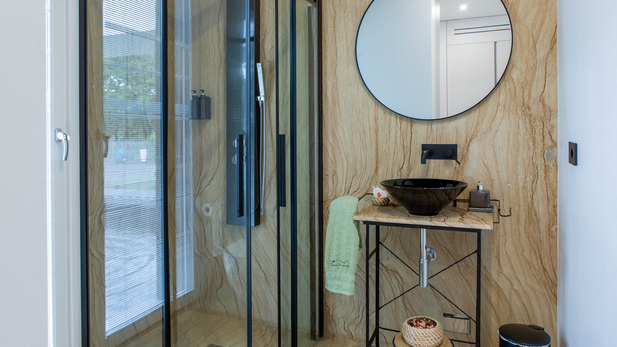 Bagno elegante in pietra pregiata con doccia idromassaggio, set cortesia e asciugamani